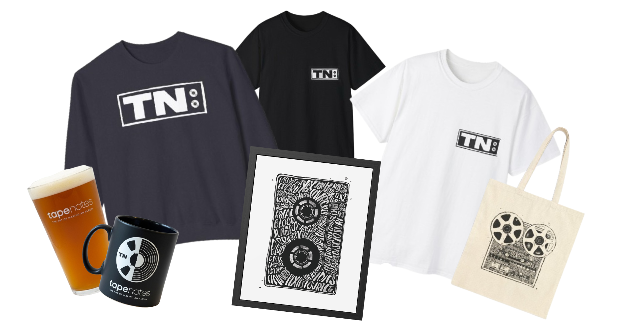 OUR MERCH NEWLY RELEASED TAPE NOTES MERCH IS NOW AVAILABLE ON OUR SHOPIFY STORE – INCLUDING MUGS, T-SHIRTS, JUMPERS, PINT GLASSES AND MORE. CLICK ON THE IMAGE BELOW TO GRAB YOURSELF SOMETHING NICE AND BE PART OF THE TAPE NOTES COMMUNITY! Merch Store